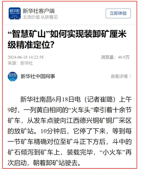 6月18日,新华社客户端刊发文章《“智慧矿山”如何实现装卸矿厘米级精准定位?》,介绍了江铜集团德兴铜矿进行的“5G+电机车无人驾驶应用”项目。